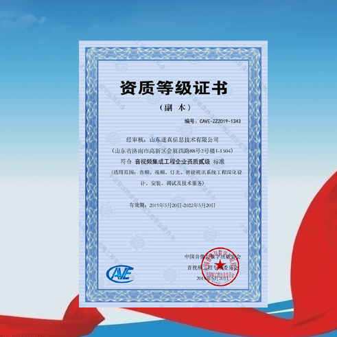 公司獲得中國音像協(xié)會音視頻工程專業(yè)委員會頒發(fā)的《音視頻集成工程企業(yè)資質(zhì)貳級》證書,成為省內(nèi)首批通過該權威機構認證的二級資質(zhì)企業(yè)。